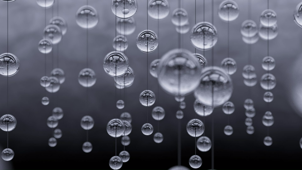 4K UHD 3D animation: Glass orbs hanging on strings - artistic installation